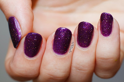 Today is a Purple/Sharpie marble day in June 30 Days of Colour challenge. I never tried sharpie marble and normally I would jump on something new like this. This time unfortunately I could not find inspiration for it and prepared simple swatch of purple polish Plum outta ideas. This my first and only polish from Wing dust and I was very happy with the quality. It's purple jelly with glitters, mostly golden and purple with a hint of red and holo blue. I love glitters in this polish they are tiny and make a wonderful combination. Two coats look a bit sheer on pictures, so I guess three coats would be safer.